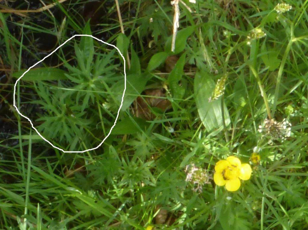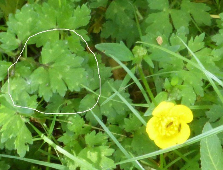 Prior to passing the forestry loading area, almost all the buttercups you will have seen are Creeping Buttercup, a plant which, as the name implies, readily spreads along the roadside (and elsewhere, including gardens!) by means of its rooting runners. But now, on entering the wooded section of the road, it is possible to make a comparison with its non-creeping relative, the Meadow Buttercup. The flowers of Creeping Buttercup are a slightly deeper, almost waxy, yellow but such difference is not always easy to see. Often it is better to look at the leaves; Meadow Buttercup tends to have much more deeply-toothed, spikier leaves whereas the Creeping Buttercup leaves are slightly rounder, often with whitish, central blotches. Another difference is that the latter alone has furrowed flower-stalks.